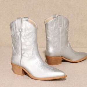 Experience the perfect blend of style and comfort with Metallic Western Booties. The Claire Western Luxe Kinsey Booties, crafted from premium vegan leather with Mi.iM metallic finish and delicate stitch embroidery, add Western glam to skirts, dresses, and more. The mid-calf length provides both support and versatility, making them a must-have for any wardrobe.