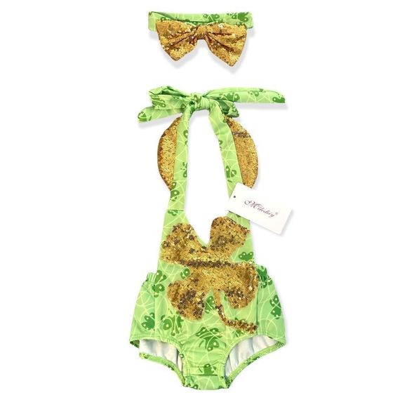 NWT Milediiy St. Patrick’s Day green gold sequin romper matching headband