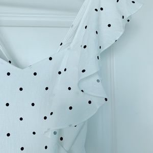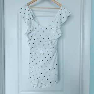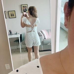 Milk and Honey polkadot romper. Size Small. Adjustable ties in the back and a hidden zipper on the shorts. Beautiful open back. Lightweight material. I wore with no bra and it wasn't see through.