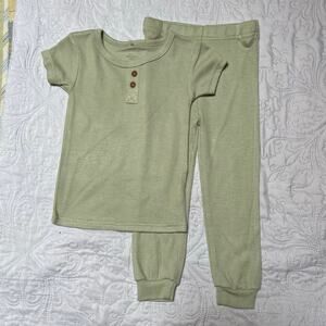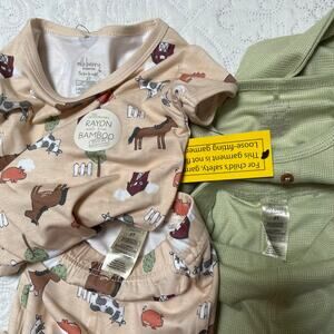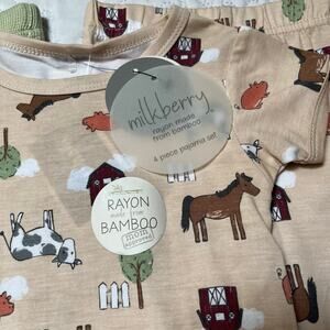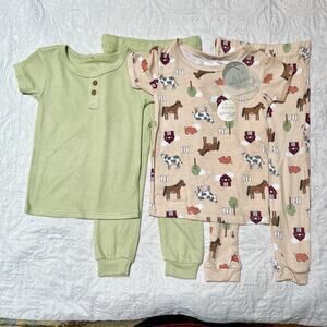 New with tags Milkberry two piece pajamas bundle in super soft bamboo. Includes neutral earth tone farm animal print and green thermal Henley style. Size 2T.