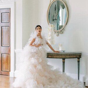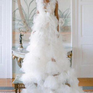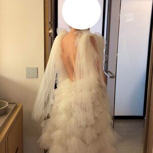 Intended to wear this at my wedding after party but went with a different look! This is a custom, shorter version of the one shown on the model. Tulle, low back mini gown with long shoulder ties and removable tie tulle waist belt. It was constructed in a "warm white" and hits at the mid-calf (I'm 5'10) but could easily be shortened. The inside is lined with a silk liner (see photos 7 and 8).