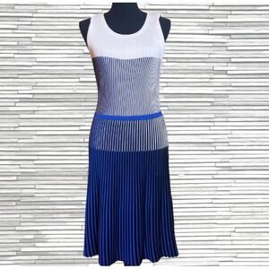 This NWT Milly white, blue and black dress is elegantly ribbed and pleated. It falls naturally around your curves. Plenty of stretch. Dress has some weight to it.