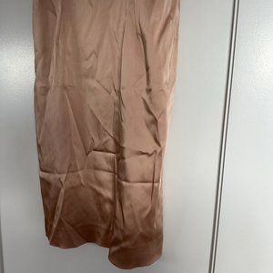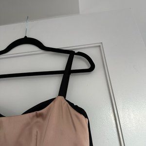 Very flattering peach mini dress with thick black spaghetti straps. Falls just below the knee