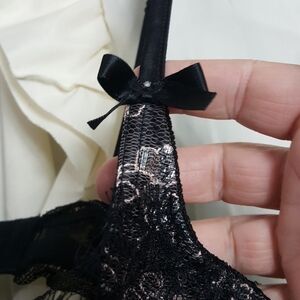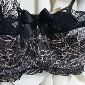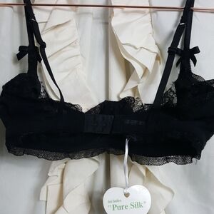 NWT Mimi Holliday silk embroidered black lacy bra. Adjustable straps. Bow details on the straps. Beautiful pink and silver floral embroidery. Bow in center of cups. Dainty eyelash fringe lace at top of cups. Mesh lace at top of bra. Excellent condition