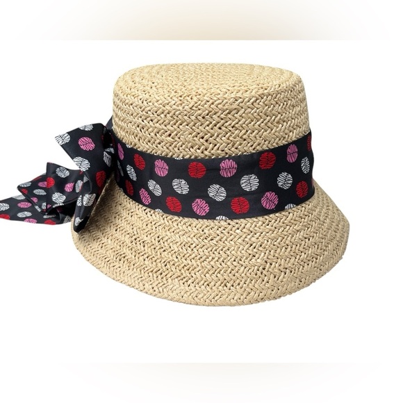 NWT - Chic raffia straw bucket hat featuring a black silk ribbon with “Minnie Mouse” in circles of red, pink, and white. Perfect for sunny days.
