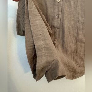 Stylish brown romper with button-up front and short sleeves. Features two front pockets.
