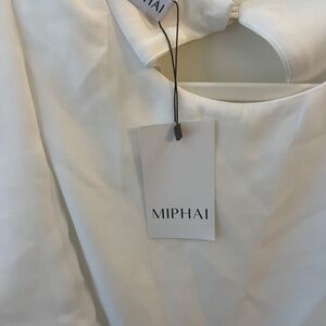 Brand new with tags Miphai white flutter sleeve dress, midi length with open back and beautiful now detail. Purchased as an engagement shoot option but it was sadly too cold out to wear. Beautiful dress for anything bridal, graduation, or for any event!