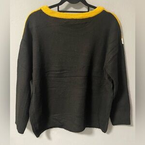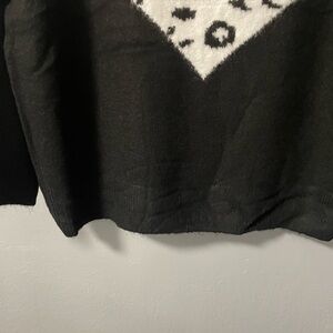 Long aleeves. Black and white animal print with black and yellow colorblock in a V-Pattern. Solid black on the back. Acrylic/ Poly/ Spandex blend. Boxy fit.