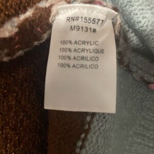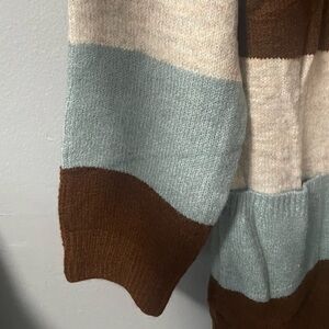 Wide stripes pattern in blue, brown, pink, and heather grey. Long sleeves. Front pockets. Ribbed hem. 100% acrylic.