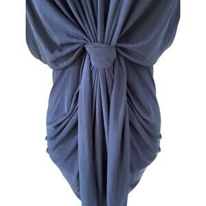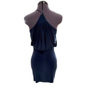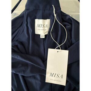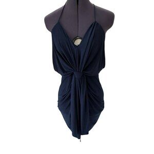 NWT Misa Los Angeles Domino Bodycon Mini Dress Dark Navy V-Neck Racerback With Flattering Draping. This dress embodies effortless sophistication with its draped silhouette, knotted detail, and striking lipstick red hue. Crafted from a soft and stretchy polyester-spandex blend, it offers comfort and style for a polished look. The racerback and spaghetti straps enhance its modern elegance, while the lined bodice ensures a smooth fit.
