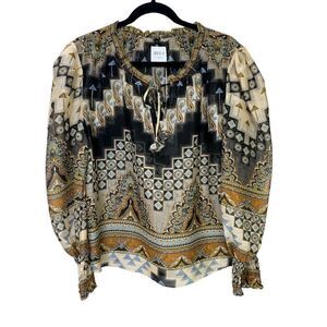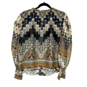 NWT Misa Los Angeles Womens Geometric Print Sheer Peasant Seina Blouse Blue Tan Size XL