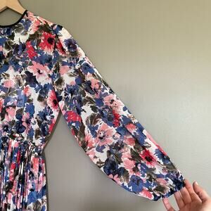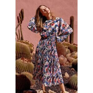 New with tags Anthropologie Misa Meadow Pleated Midi Dress, Misa Los Angeles Juliana Dress, Size XS, Sheer Blouson Bodice and Pleated Midi Skirt with Slit, Long Sleeves, Crewneck, Blue Pink White Watercolor Floral Print, Elasticized Waist