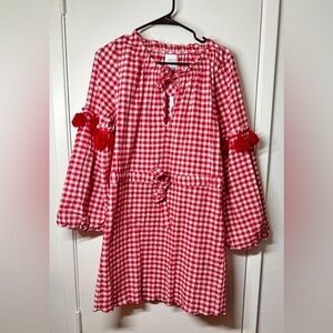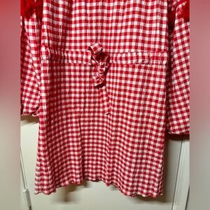 Red and white gingham plaid, long puff statement sleeves with red fringe trim, mini length, drawstring waist, unlined, elastic cuffs, keyhole neckline cut out with neck tie, textured fabric, Americana, Fourth of July, summer, beach, nautical, coastal