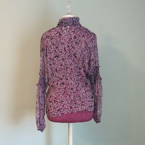 Chic floral blouse with long sleeves. Features a mix of soft pinks and violets.