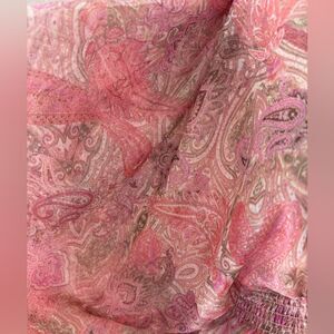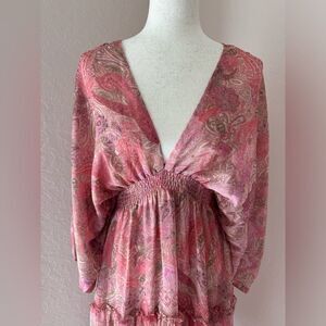 In a classic silhouette that flatters all figures, Stefanya stuns in a muted paisley chiffon. The deep v-neckline meets at the smocked elasticated waist and features billowy sleeves with an elastic cuff. An open back features a tie closure at the neckline finished off with our signature petal tassels.