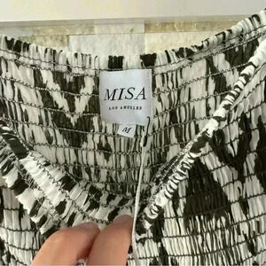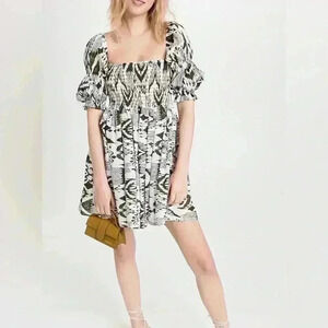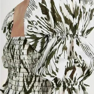 NWT. Green and white abstract pattern. Smocked bodice with elastic cuffs at sleeve. Unlined. 100% cotton. Runs true to size. Can be worn off shoulder or on shoulders as shown on model.
