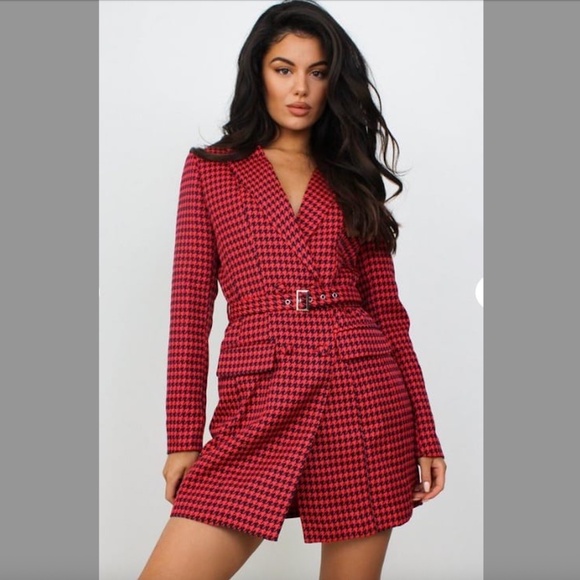 NWT Misguided Belted Blazer Dress Houndstooth Red