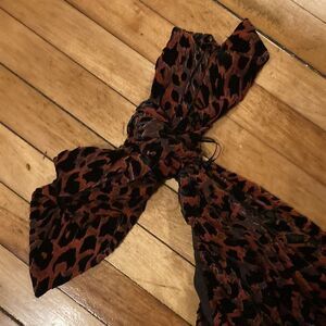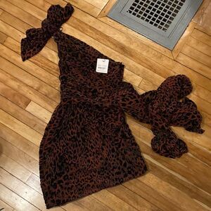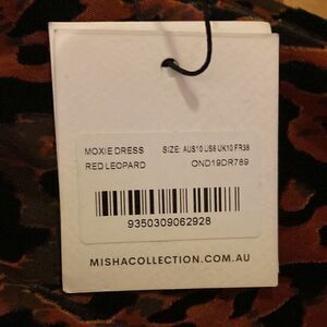New with Tags Misha Moxie dress in red leopard, size 6 (US). Features a bow on the shoulder and a wrap around belt.
