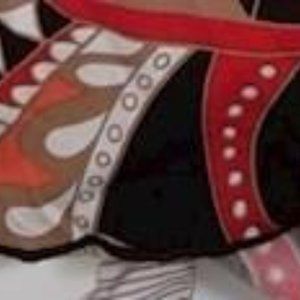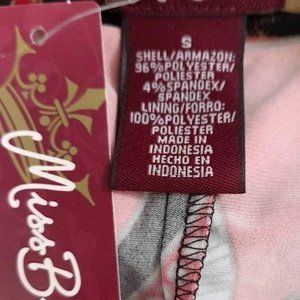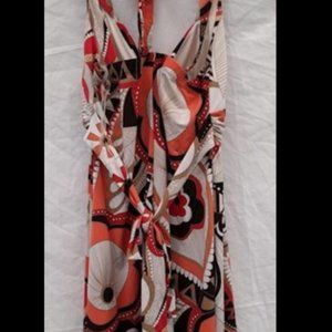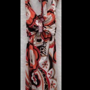 Brand new, never worn Miss Bison halter dress with shoulder straps in size Small. Fabric is a poly/spandex blend of an abstract floral design of orange, tan and brown shapes on a white background. Fully lined and padded cups offer support and structure to a flattering twist style bodice. Flowing skirt from waistline to flounce hem. Comfort and style for under $20.
