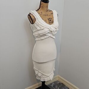 NWT Miss Circle (Revolve) white bodycon dress, criss cross ruffles and crystal jewels adorn the bust and hem, sleeveless, invisible side zipper, size Small. Excellent new condition, measurements in pics, smoke free home, ships next day. Bundle and Save!