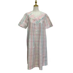 NWT Miss Elaine Pastel Pink Plaid Embroidered Housecoat Robe with Snap Closure and Pockets