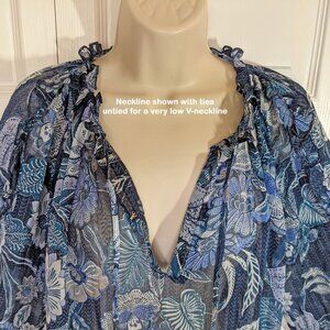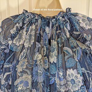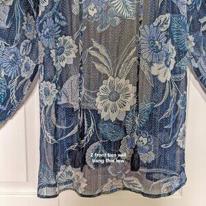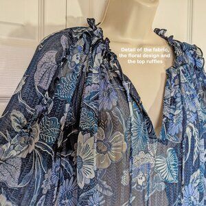 With its £134 price tag still attached, this never worn Miss June Paris pullover blouse is pure Boho Chic fantasy. The semi-sheer fabric is 95% Rayon with 5% Metallic. Designed in Paris and Made in India, it has an overall fabulous blue and cream floral pattern that is registered to these designers. A high rounded neckline has narrow ruffle trim and front ties that you can choose to loop, bow or leave hanging. Each version is shown in these photos. Those front ties have 2 inch long navy blue tassels. Long sleeves are slightly gathered, with an inset shoulder line. Two sets of ruffle trim and smocked cuffs complete the fabulous sleeves.