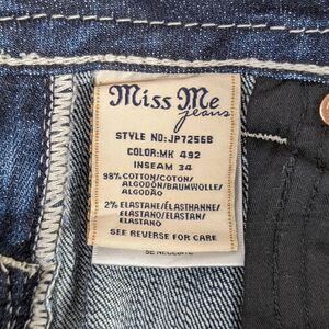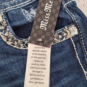 Take center stage in a pair of Miss Me jean super short cutoff shorts with eye-catching trim along both the front and back pockets with distressing, fading, whiskering, and logo hardware.