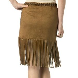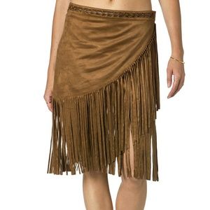 Super fun, sexy and neutral ultra suede fringe wrap skirt. 100% polyester and hand washable. Detailed waistband. Fully lined. Approx 23" long.