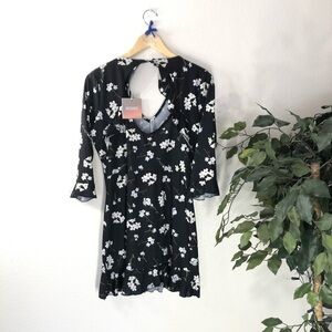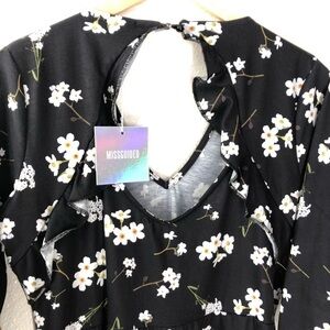 A sweet dress with frill at the end of the sleeves, bottom and as an accent on the back. V cut with an open back and button to keep it closed.