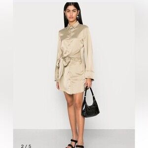 NWT Missguided Tie Waist Flare Sleeve Shirt Dress Satin Sage 4