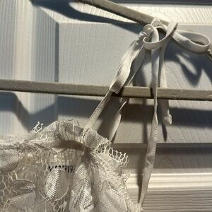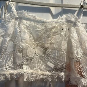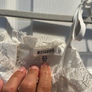 NWT! Missguided White Spotty Lace Sheer Beach Crop Top women’s size 12. White, spotty lace mesh, unlined, adjustable tie straps, zipper in middle of back, sheer, lace trim, crop length. Offers accepted!