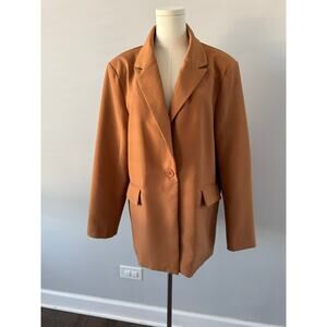 NWT Missguided Women's Tailored Oversized Blazer in a chic camel shade. Designed with a relaxed, boyfriend-inspired fit, it features a longline silhouette and a sleek lapel shawl collar. Made from a soft polyester blend with a touch of elastane for comfort, this blazer brings an elegant yet casual vibe. The one-button front closure adds a classic touch, perfect for versatile styling. Ideal for layering over any outfit for an effortlessly polished look.