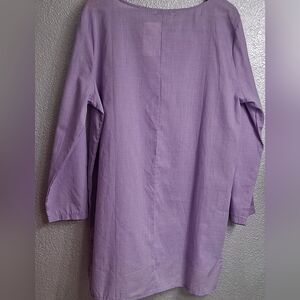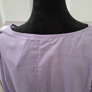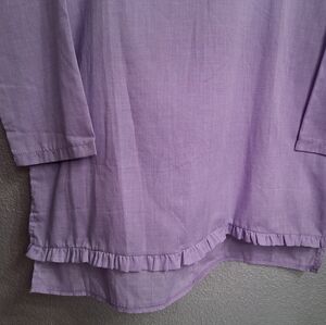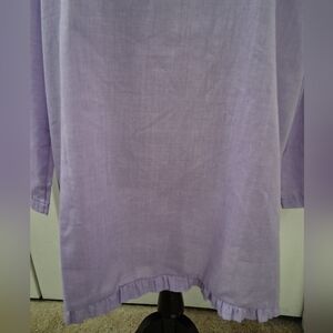 new condition, boat neck, ruffle hem, side slits, tunic length, polyester/cotton blend