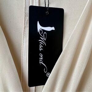 New with tags Missord chiffon mini dress in a soft buttercream (tagged “apricot”). Designed with a deep plunging V neckline, empire waist, and tiered ruffle hem for a flowy silhouette. Statement bell sleeves add a boho-glam touch, perfect for weddings, cocktail parties, or going-out looks. Lightweight 100% polyester with back zip closure. Lined. Size XL.