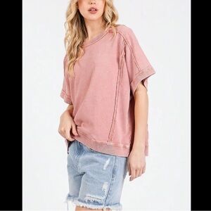This casual top from Mittoshop is made from a soft mineral wash French terry fabric, combining comfort with a trendy look. The crew neck design, dropped shoulders, ribbed trim, and exposed seams detailing add fun touches to the relaxed silhouette. Elevate your laid-back wardrobe with this cozy and chic top! New with tag, Antique Pink color, Sz. Medium