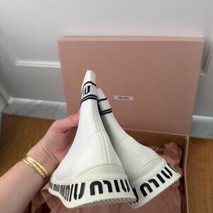 NWT Miu Miu High Top Sock Sneakers White Knit Logo Pattern Rubber Sole