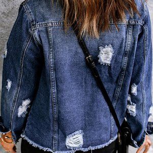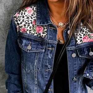 NWT - Mixed Print Distressed Button Front Denim Jacket