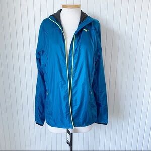 NWT Mizuno hooded jacket. Blue sapphire is the color. It’s a dark turquoise. Neon green detailing. Heat generating. Thermo that breathes. Zipper down the front. Two front zip pockets. Thumb holes. great for working out in colder temps. Super thin and easily packable. Perfect travel piece.
