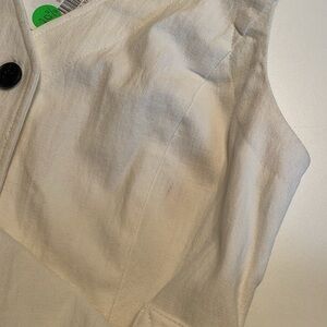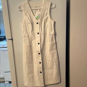NWT versatile piece perfect for both casual and work settings. Crafted in a chic sheath style, this dress features a flattering v-neckline and a buttoned front, offering a modern and sophisticated look. Its midi length and sleeveless design make it ideal for warm weather, while the cream and white color palette adds a touch of elegance to any outfit.