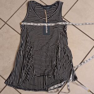 New with tag ModCloth Every Direction Knit Tank Dark Navy Blue White Striped Sleeveless Top. Stylish dark navy blue and white striped sleeveless top by ModCloth. Features a flattering v-neck and flared hem. Size XXS please see measurements pictures to be sure of fit.