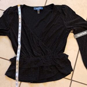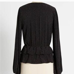 NWT ModCloth Layered In Luminosity faux wrap top, balloon sleeve blouse in black chiffon with rainbow metallic finish. Peplum tiered ruffle hem. Size XS please see measurements pictures to be sure of fit.