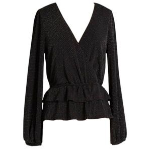 NWT ModCloth Layered In Luminosity faux wrap top, balloon sleeve blouse in black chiffon with rainbow metallic finish. Peplum tiered ruffle hem. Size XS please see measurements pictures to be sure of fit.