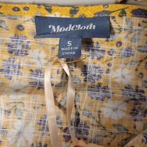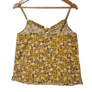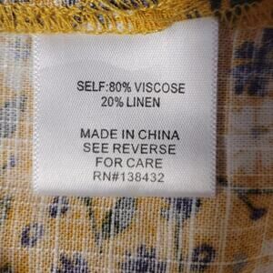Features: thin adjustable straps, viscose/linen blend, mustard yellow, white, dark green, and purple floral, petite ruffle and a tie along its keyhole-accented neckline, petite side vents, no stretch