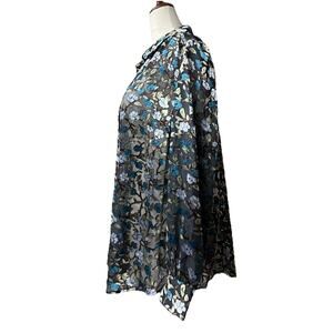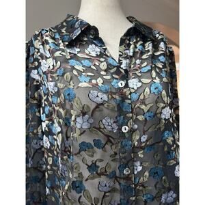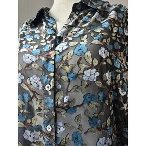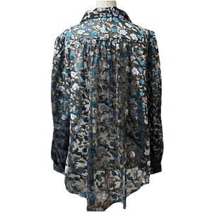 ModCloth NWT floral velvet burnout sheet button up top with collar. Silver, green, brown, blue and black hues. Size 1x- measurements and tags in photos.