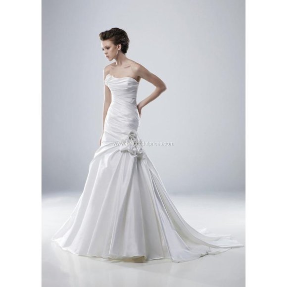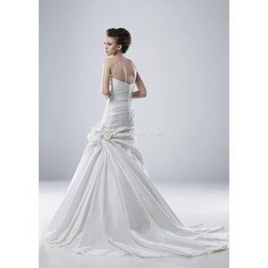 NWT Modeca Wedding Dress. Brand new with tags. Fabric is a soft taffeta and has 2 roses made from fabric on bust and hip. Full skirt below tapered A-line bust.