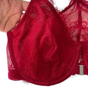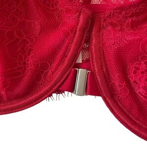 Gorgeous red lace bra from Modern Movement. This opens in the front with a silver clasp and has a lace racerback. Adjustable straps and underwise. NEW WITH TAGS- never worn or washed. Size 34DD.
