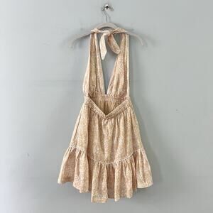 NWT Mon Renn Havana Crochet Print Tan Linen Halter Mini Dress