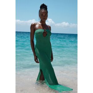 Elegant green swim coverup. Strapless design with keyhole detail. Perfect for beach or poolside.