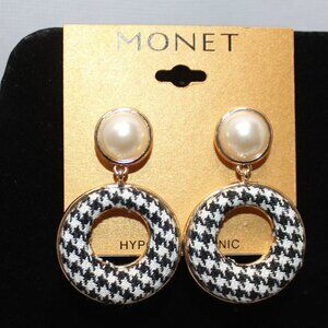 New With Tags Monet Black and White Herringbone Fabric Hoop Earrings
