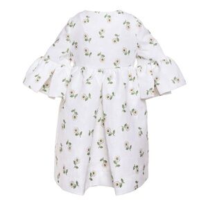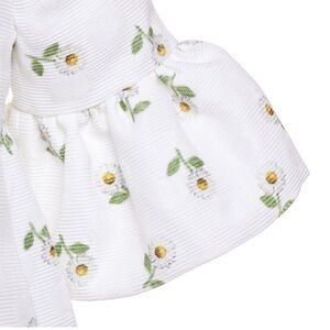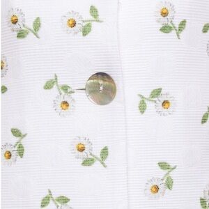 The finest topcoat, of precious ottoman fabric with embroidered mini daisies, slightly flared, maxi buttons and spectacular sleeves